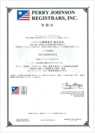 弊社ではHACCPも組み込まれたISO22000:2018 と、海外輸出には欠かせない健康補助食品GMPの両方を認証取得しております。