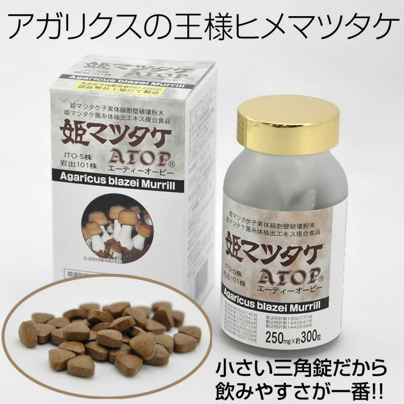 他の画像を見る アガリクスサプリを選ぶなら姫マツタケATOP 《純正アガリクスの王様》姫マツタケATOP粒 300粒入り一箱 1回のみ・定期 定価 ¥ 17,280 税込 ヒメマツタケを特許取得済みの製造方法で、より飲みやすく仕上げたのが『姫マツタケATOP(エーティーオーピー)』 日本で菌株を管理し、一番アガリクスの栽培気候に適している原産国パラグアイで育ち、信州信濃の広大な自然と澄んだ空気の中で作っている健康食品です。 詳細を見る お気に入りに登録する