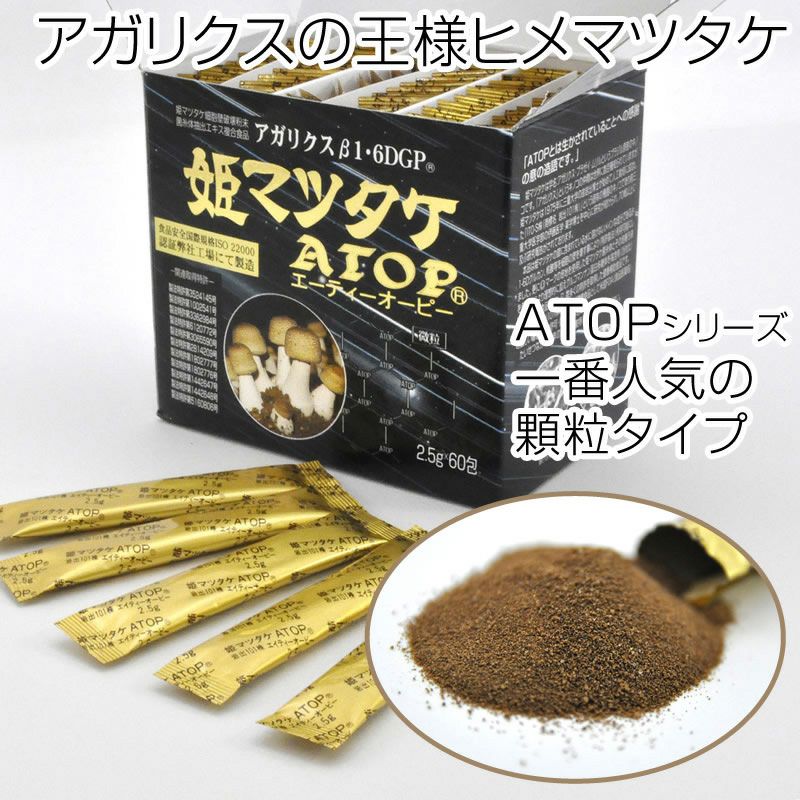 他の画像を見る 《純正アガリクスの王様》姫マツタケATOP顆粒(粉末) 60包入り一箱 1回のみ・定期 定価 ¥ 32,400 税込 ヒメマツタケを特許取得済みの製造方法で、より飲みやすく仕上げたのが『姫マツタケATOP(エーティーオーピー)』 日本で菌株を管理し、一番アガリクスの栽培気候に適している原産国パラグアイで育ち、信州信濃の広大な自然と澄んだ空気の中で作っている健康食品です。 詳細を見る お気に入りに登録する