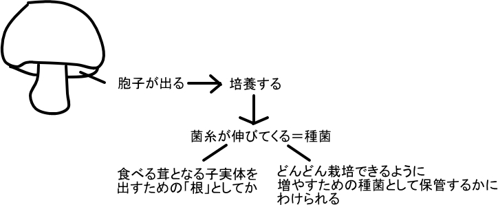 培養菌糸が出来て、子孫を残したいと察するよう条件揃わせるとキノコの部分である子実体が出てきます